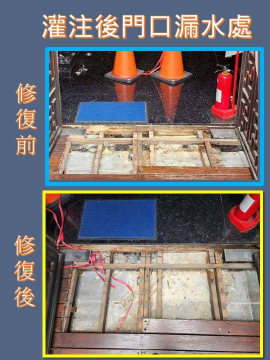 工程實績 管內修復 大樓水錶區地板不停滲水 WORK 工程實績 全部分類 開挖-儀器定位 管內修復 排水管 管內修復 大樓水錶區地板不停滲水 高級住宅19層大樓,頂樓水錶區共有65只住戶水錶 點我看影片👉👉https://youtube.com/shorts/0YvXjNSUq_g?feature=shared 水錶區旁 通往露台門口處 不停滲水水錶區旁室內地板插座 也是一直滲水65只水錶逐一測試,確定漏水管路後,進行免打牆管內灌注修復漏水水管灌注後一星期,原本漏水處已經完全乾燥,不再漏水。 回上一頁